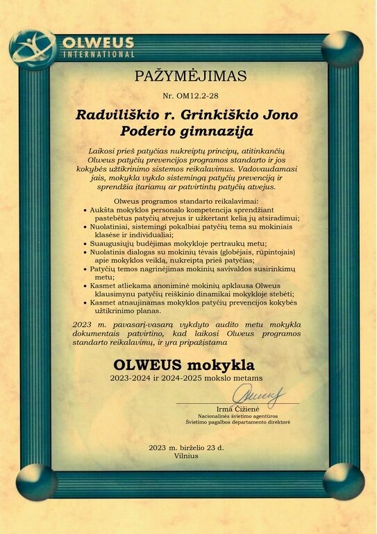 - peržiūrėta ir patobulinta pagal Olweus programą priežiūros sistemą mokykloje – „Mokinių elgesio,drausminimo ir skatinimo tvarka“;